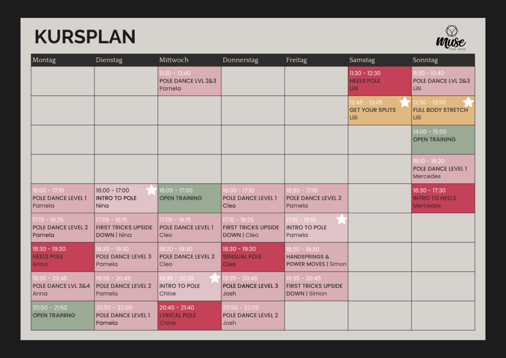 Neben unserem umfangreichen Kursangebot bietet Muse Pole Dance auch offene Trainingsstunden an. Hier kannst du, zusammen mit anderen Schülern, den Studioraum ganz frei und ohne trainerliche Anweisungen benutzen und dich mit deinen Lieblingstricks und -tanzbewegungen austoben. Ideal wenn du genau weißt, woran du arbeiten möchtest oder für dich den Stoff der letzten Unterrichtsstunde wiederholen willst. Die Aufwärmung erfolgt dabei selbstständig und ohne Anwesenheit eines Trainers.